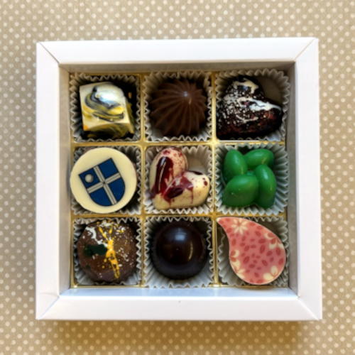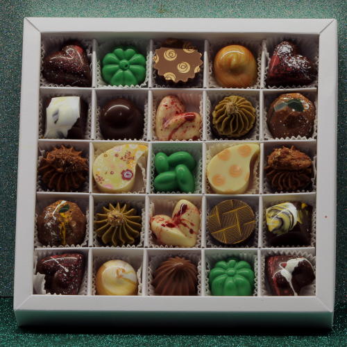 Pralinendekor je nach Sorte: Kakaobutter, Hellgrün (E104, E133). Weiß (E122, E551). Pink (E12, E170). Azorubin (E122). Blau (E132). Ocker (E172). Bronze (E555, E172). E551. Honey Gold (E102, E129). Rot (E124 od. E129). (E102, E104, E110, E122, E124, E129: Kann Aktivität und Aufmerksamkeit bei Kindern beeinträchtigen). Naturfarben: Bio-Himbeere, Bio-Hibiskus, Bio-Tagetes, Bio-Kornblume, Spirulina- u. Zitronenextrakt, Färberdistel