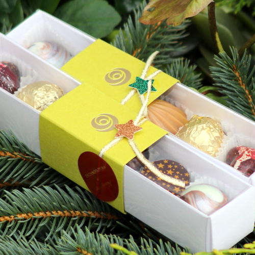 Citrus Gin: Dunkelkuvertüre 69% (Kakaokerne, Zucker, Kakaobutter, Vanille Madagaskar), Milchkuvertüre 42% (Zucker, Kakaobutter, Kakaokerne MAGERMILCHPULVER VOLLMILCHPULVER RAHMPULVER), Sahne, Citrus Gin 40%, Butter, Invertzucker